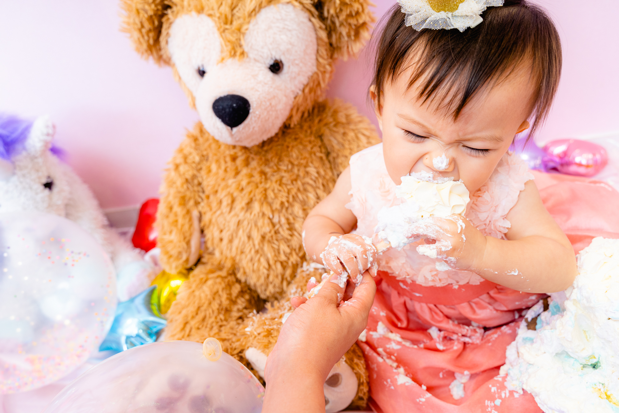 いよいよ、スマッシュケーキ!!お子様とケーキの撮影です。最初は自分のお顔よりも大きなホールケーキを食べ物だと認識していない事が多いので、スタジオでご用意しているスプーンでお子様のお口にケーキを運んであげてください♪ケーキのスポンジを食べさせてあげると、美味しさに気がついてもぐもぐ食べてくれるかも?!クリームが手について嫌だよ〜と泣いてしまうお子様、ケーキがお口にあわずに嫌がってしまうお子様も少なくありません。そんな時は、少し休憩したり、お子様の好きなおやつをケーキの下の方に仕込んでおいたり…気分転換に好きな音楽をかけたりと様子を見ながら進めていきます。