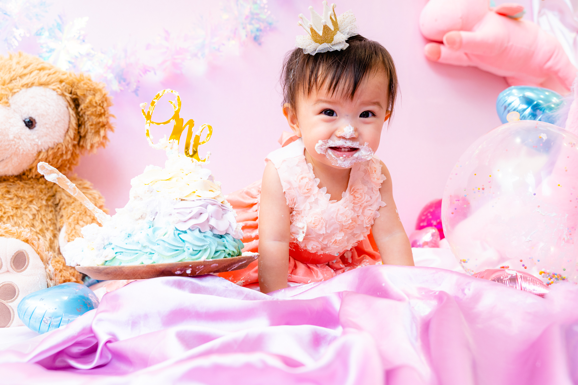 楽しんでいただける撮影です。ケーキを目の前にしたお子様の反応は十人十色、さまざまな反応があります。いろんな表情を含めてスマッシュケーキ撮影を楽しんでいただけますと幸いです。