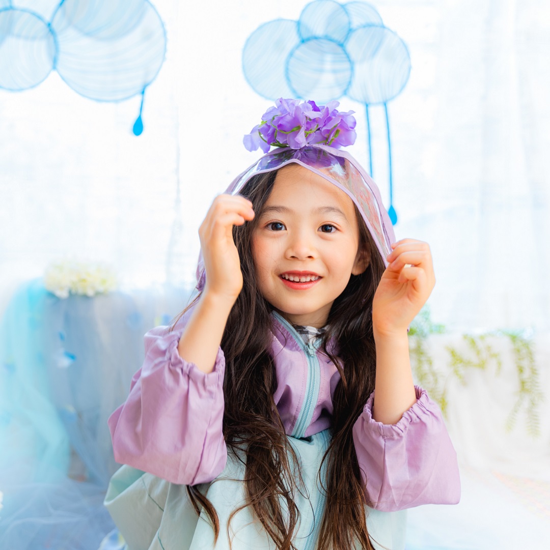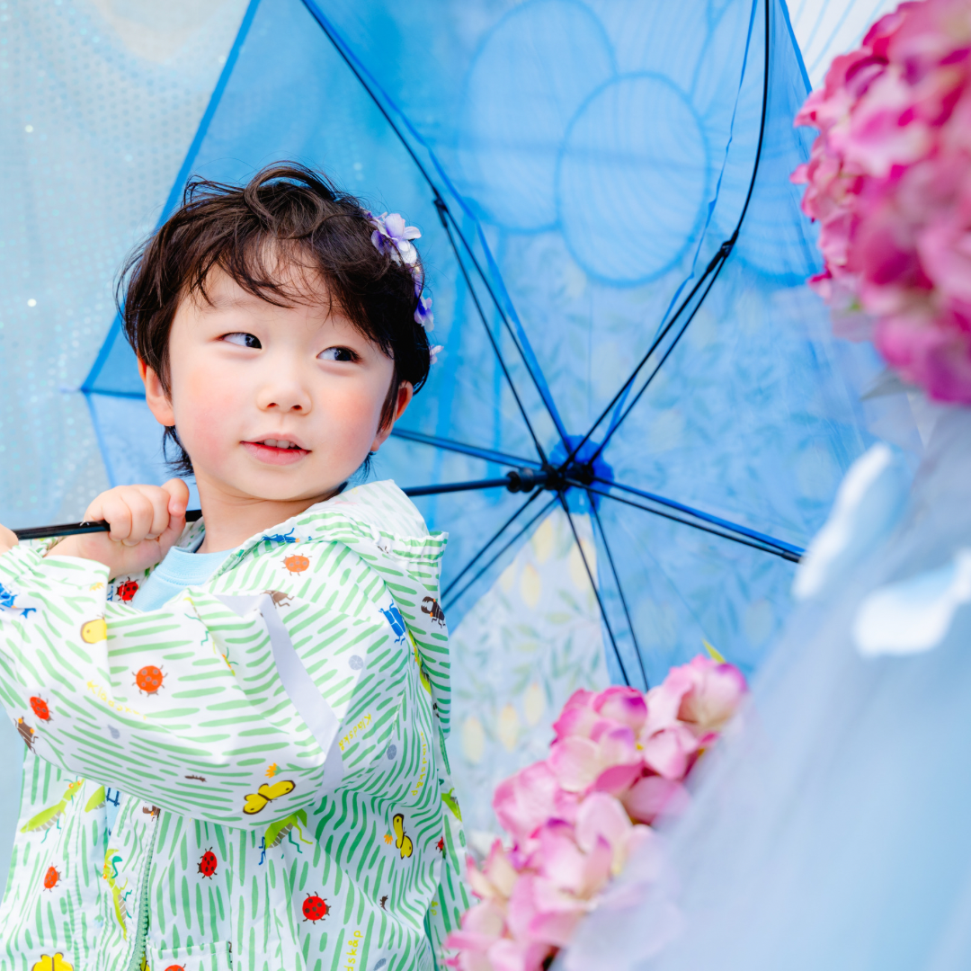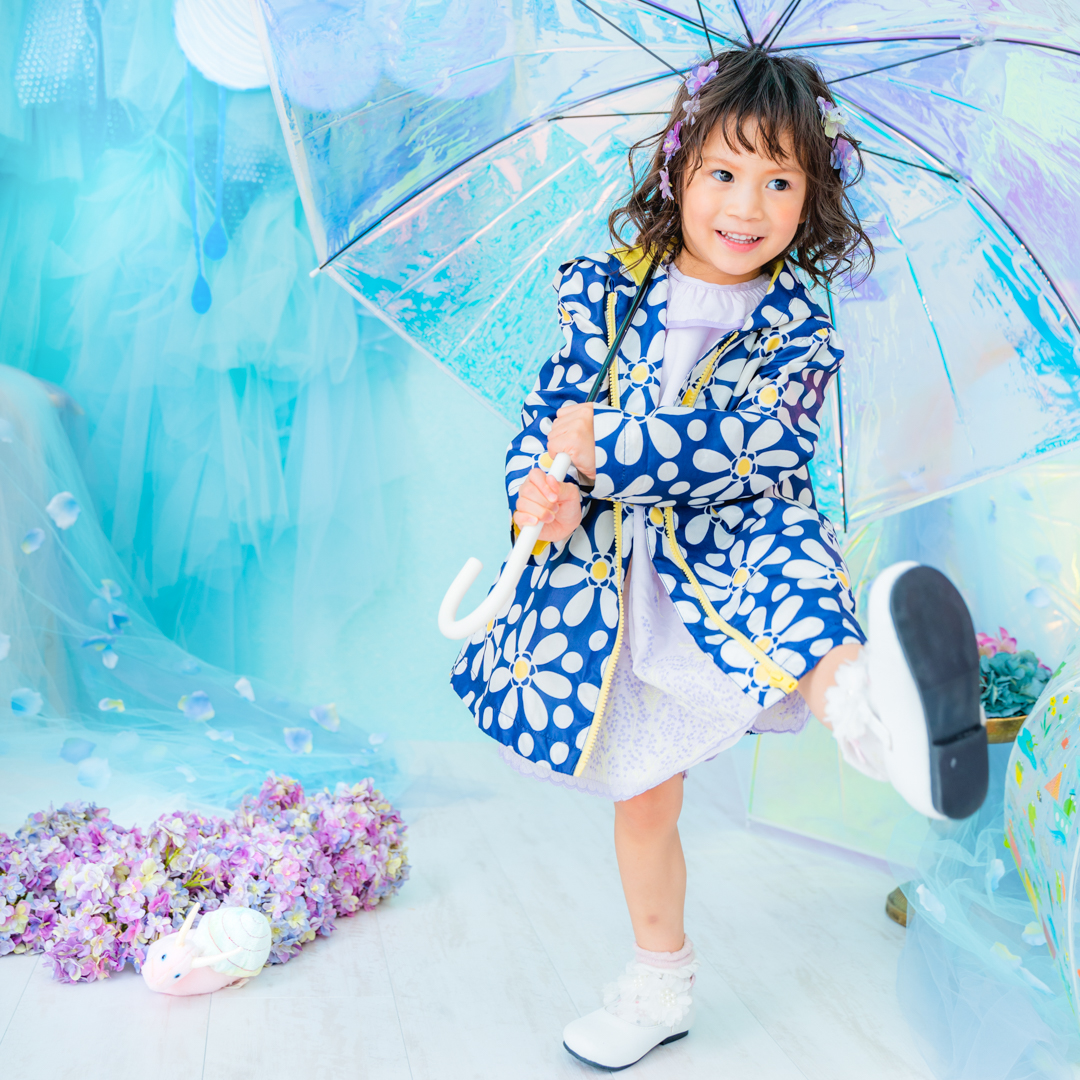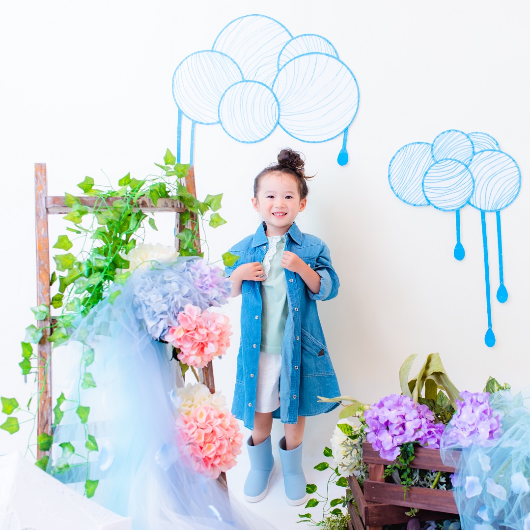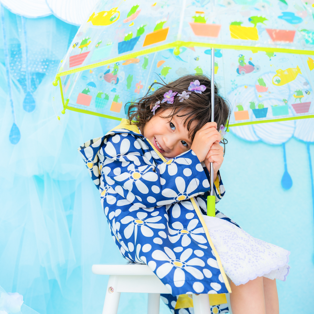 雨具などのお持ち込み衣装での撮影も可能です。お持ち込み衣装も撮影衣装数に含まれます。バースデー等、記念日撮影用衣装・小物のお持ち込みはご遠慮ください。(バースデーボード・ランドセル・着物など)