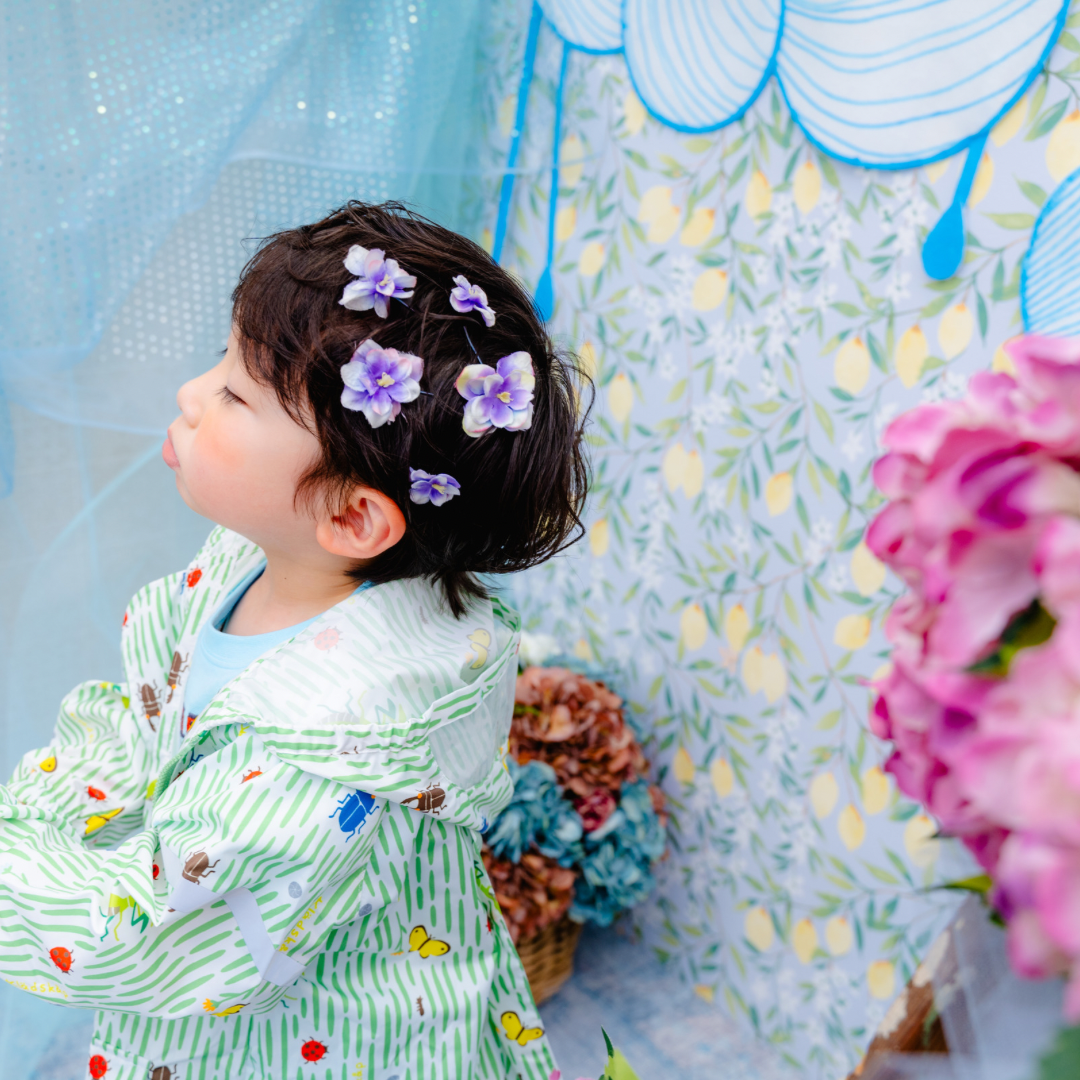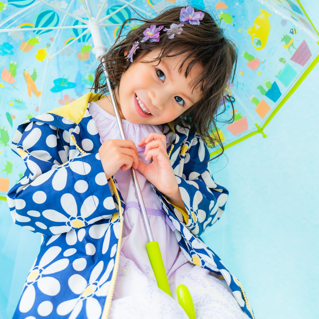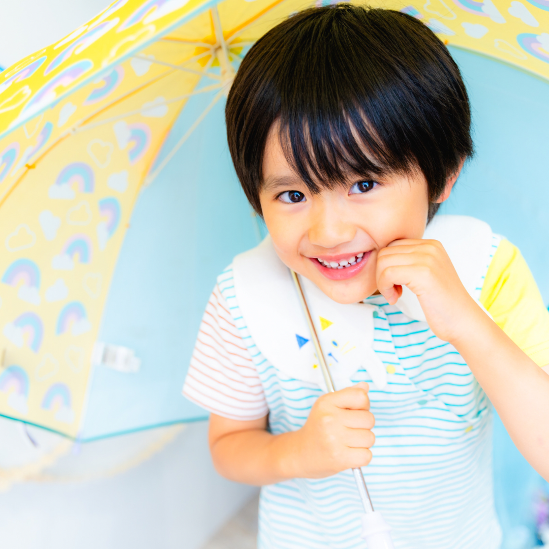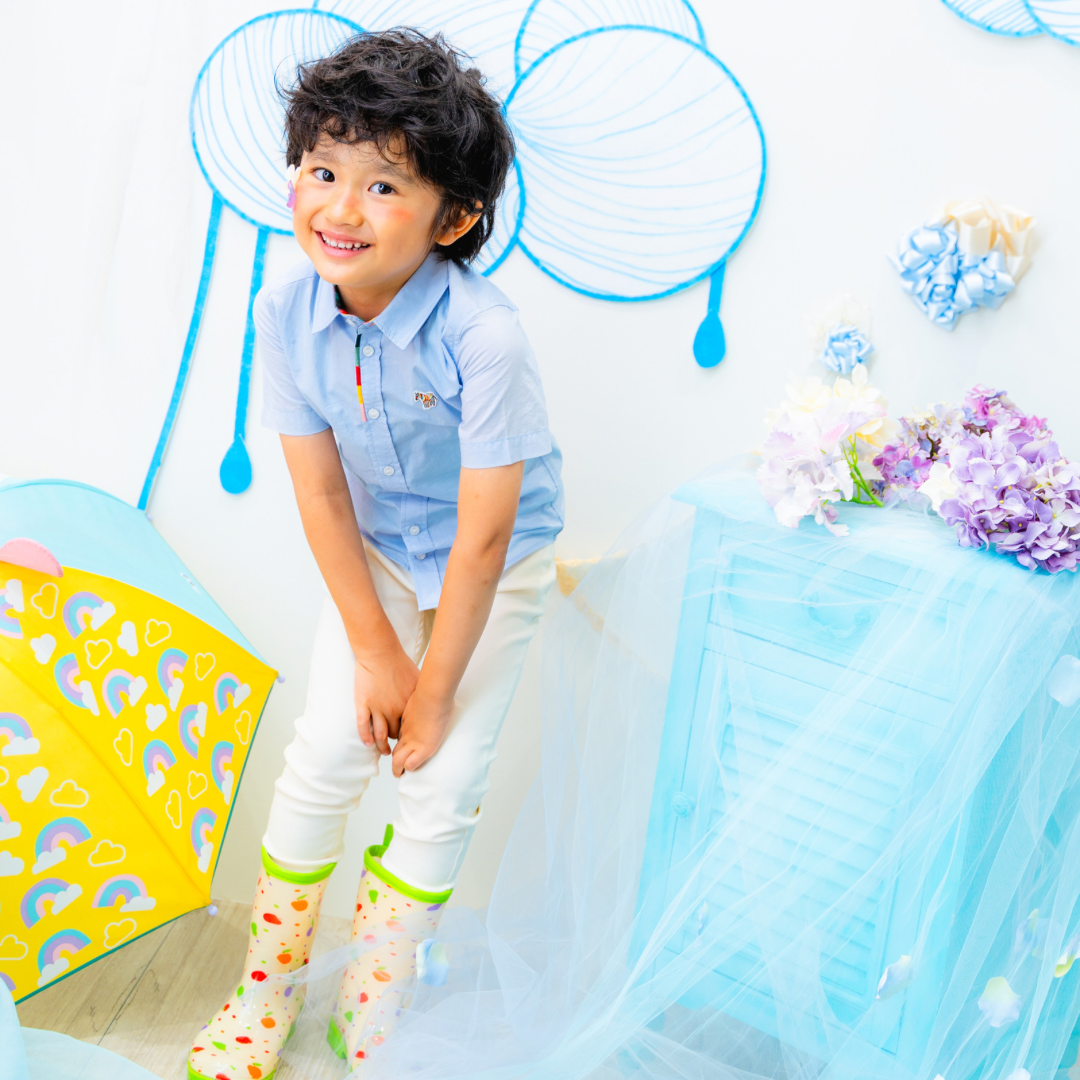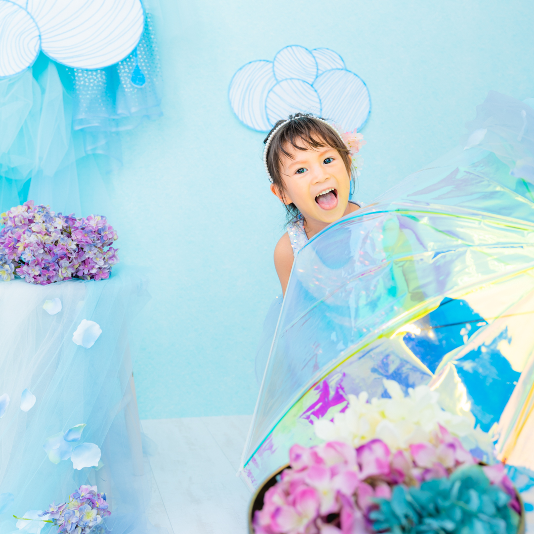 雨具などのお持ち込み衣装での撮影も可能です。お持ち込み衣装も撮影衣装数に含まれます。バースデー等、記念日撮影用衣装・小物のお持ち込みはご遠慮ください。(バースデーボード・ランドセル・着物など)