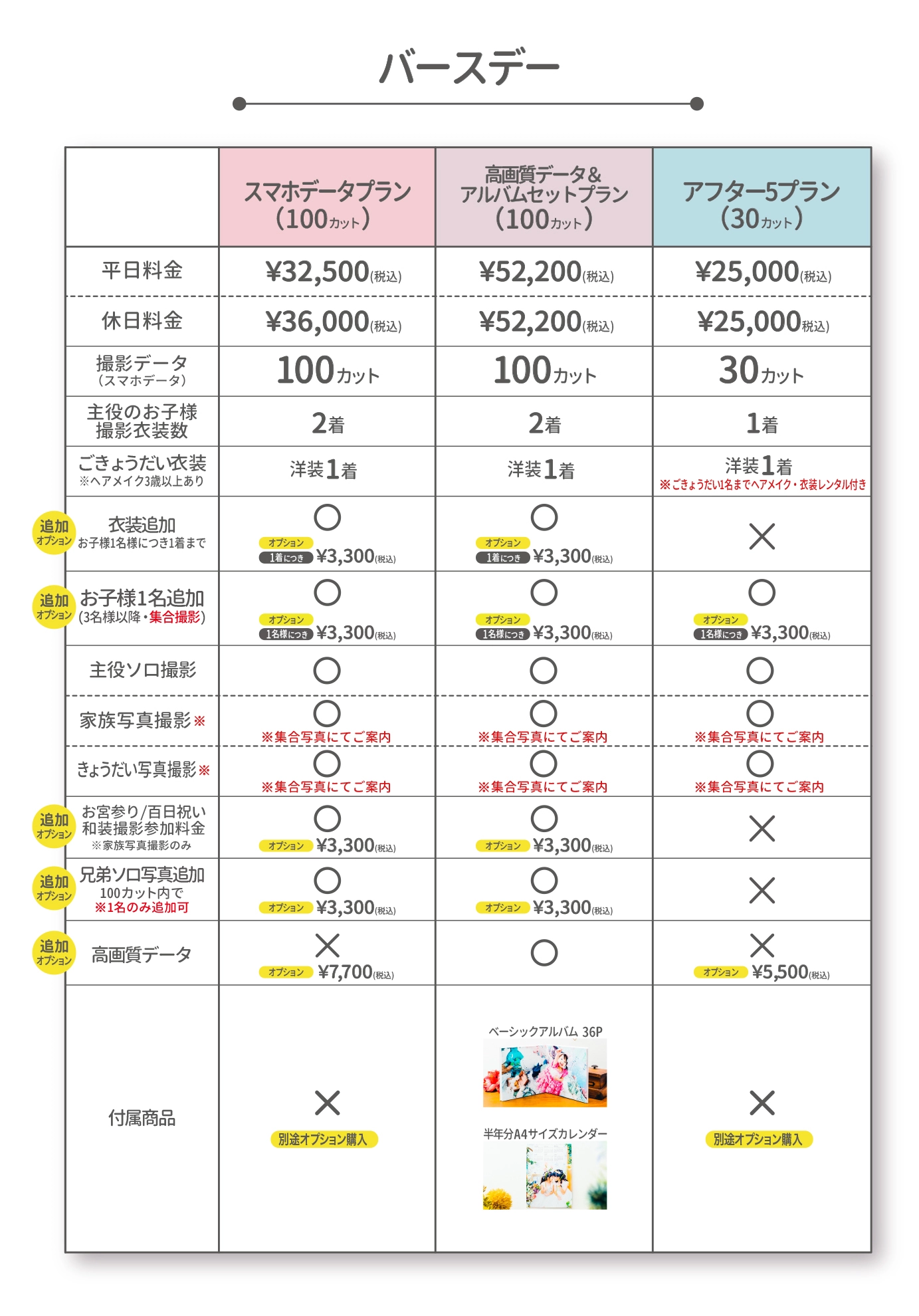 また、バースデープランでは、レンタル・お持ち込み衣装ともに和装撮影不可となります。