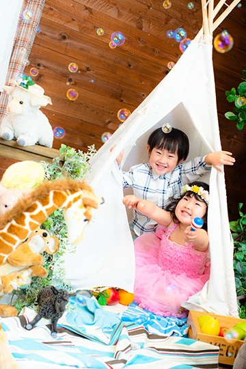 もちろん撮影可能です。参加人数により撮影の内容(シーン数・カット数)を調整させていただきます。お子様3名様以上ご参加の場合、3名様以降、1名様につき税込3,300円を頂戴いたします。ご兄弟のソロ撮影は、100カット以上のプランに限り、ご案内可能です。ご希望の場合、税込3,300円頂戴いたします。プラン内の25カットを、ご兄弟のソロ撮影としてご案内いたします。