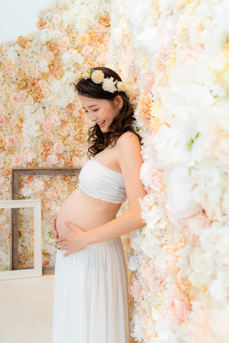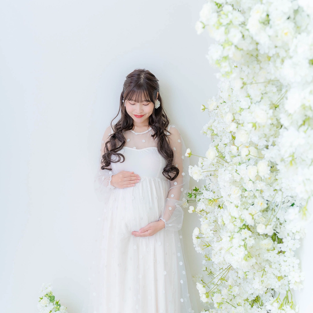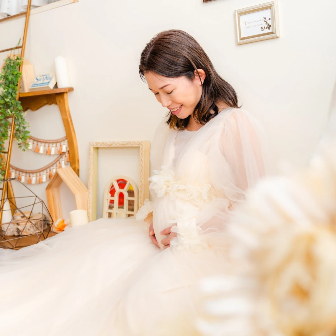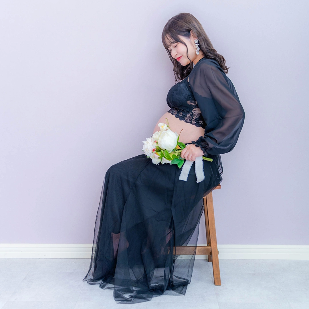 肩の出たデザインのマタニティドレスを着用される場合、ブラトップやヌーブラ、下着が透けないインナーなどをお持ちください。またお腹を出しての撮影をご希望の場合は、撮影時にお洋服の跡が残らないように、ワンピースなどのお洋服でのご来店をいただきますと綺麗に撮影することができます。デニムなどズボンのチャックをおろしての撮影の場合、下着が見える可能性がございますので、下着とは別にインナーをご持参ください。