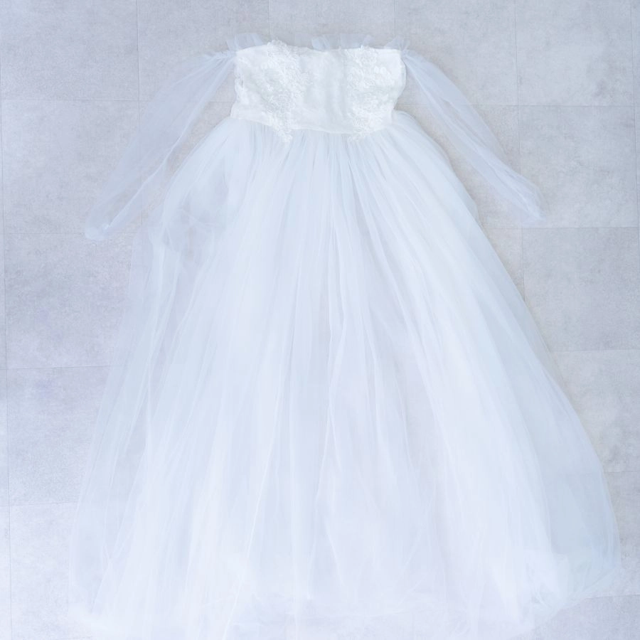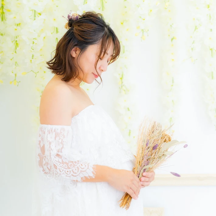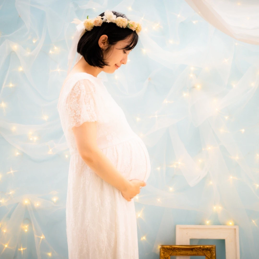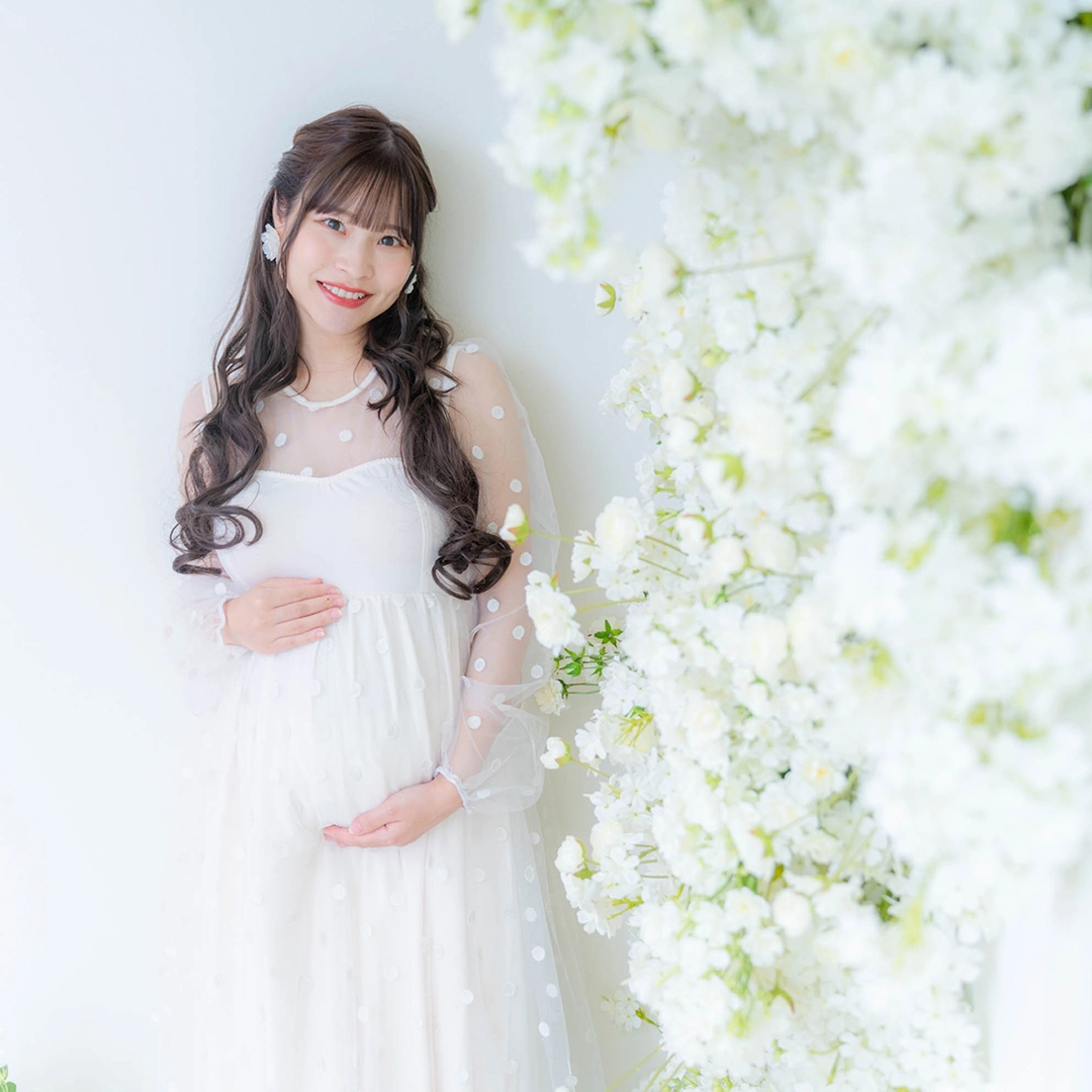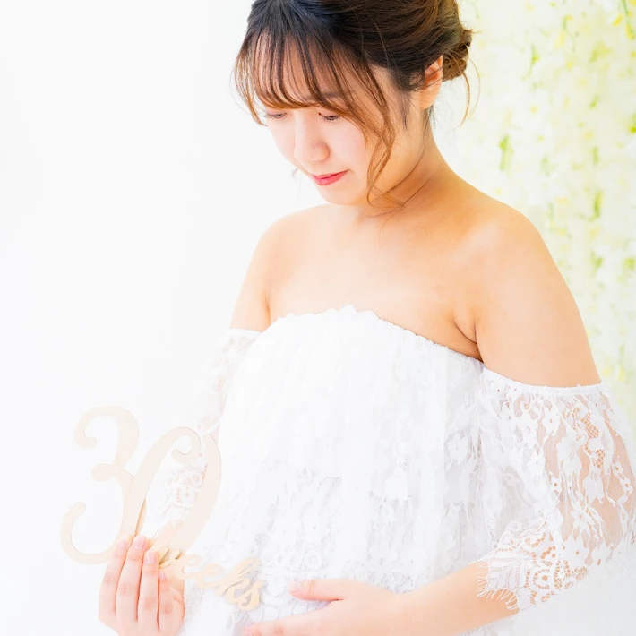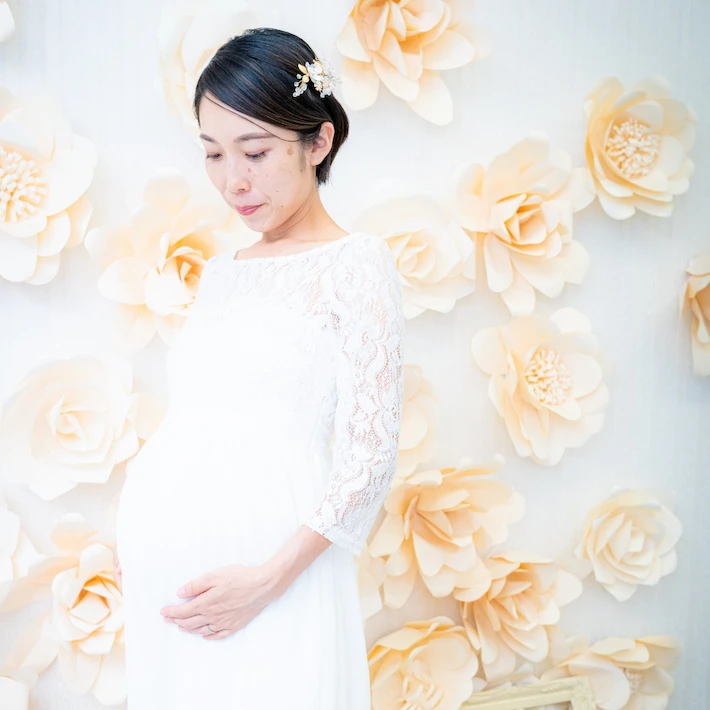 肩の出たデザインのマタニティドレスを着用される場合、ブラトップやヌーブラ、下着が透けないインナーなどをお持ちください。またお腹を出しての撮影をご希望の場合は、撮影時にお洋服の跡が残らないように、ワンピースなどのお洋服でのご来店をいただきますと綺麗に撮影することができます。デニムなどズボンのチャックをおろしての撮影の場合、下着が見える可能性がございますので、下着とは別にインナーをご持参ください。
