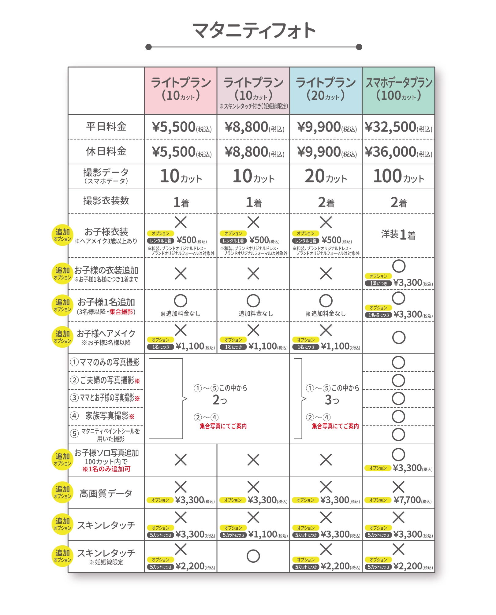 お子様3名様以上ご参加の場合、3名様以降、1名様につき税込3,300円を頂戴いたします。撮影は集合撮影に限ります。追加料金は、18歳未満のお子様が対象となります。