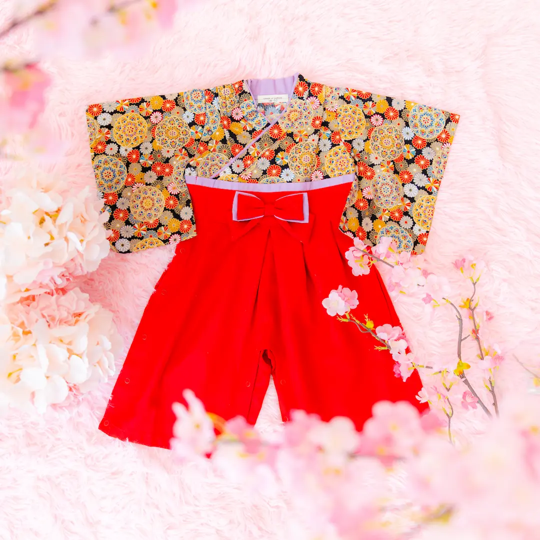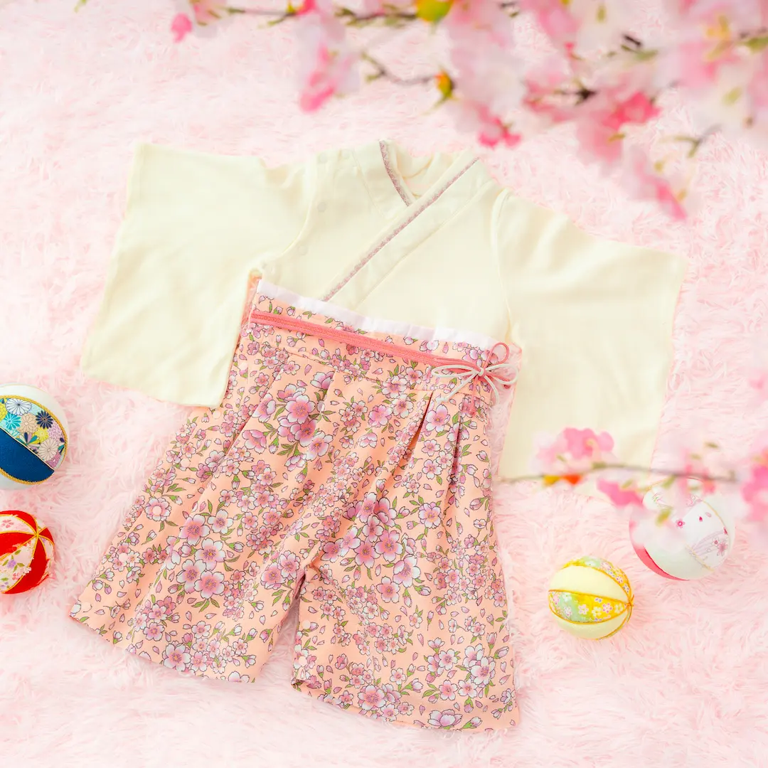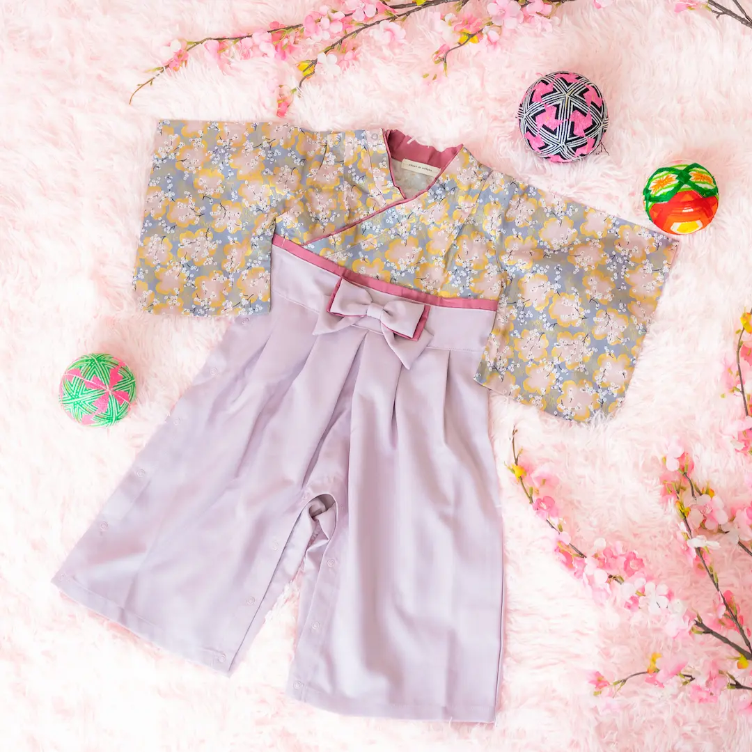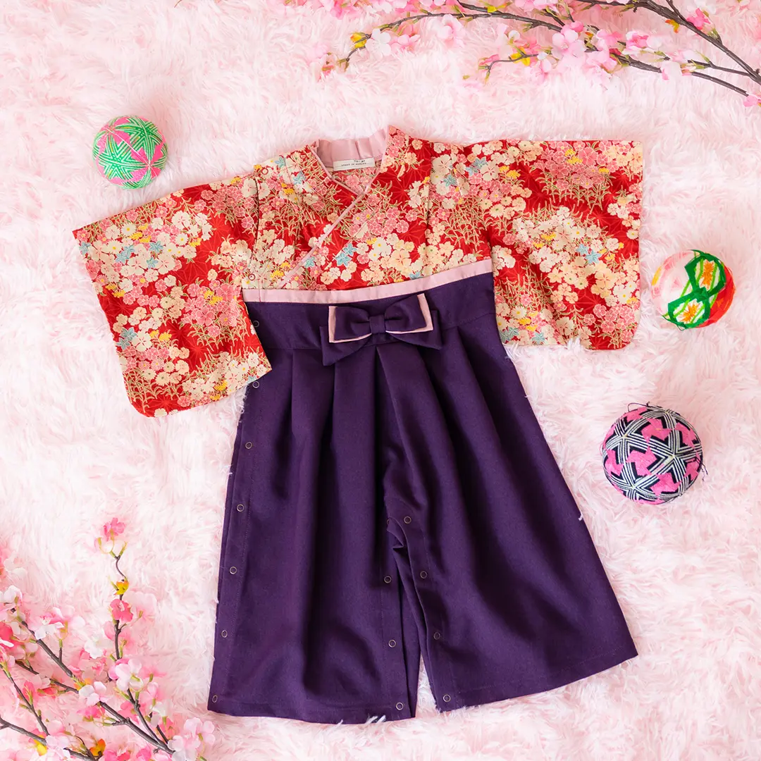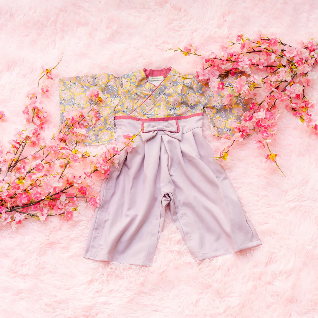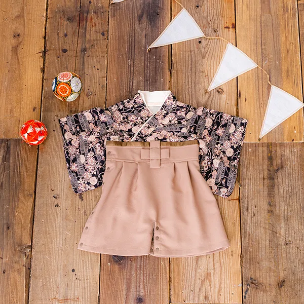 日本の伝統的なお花をあしらった袴カバーオールは