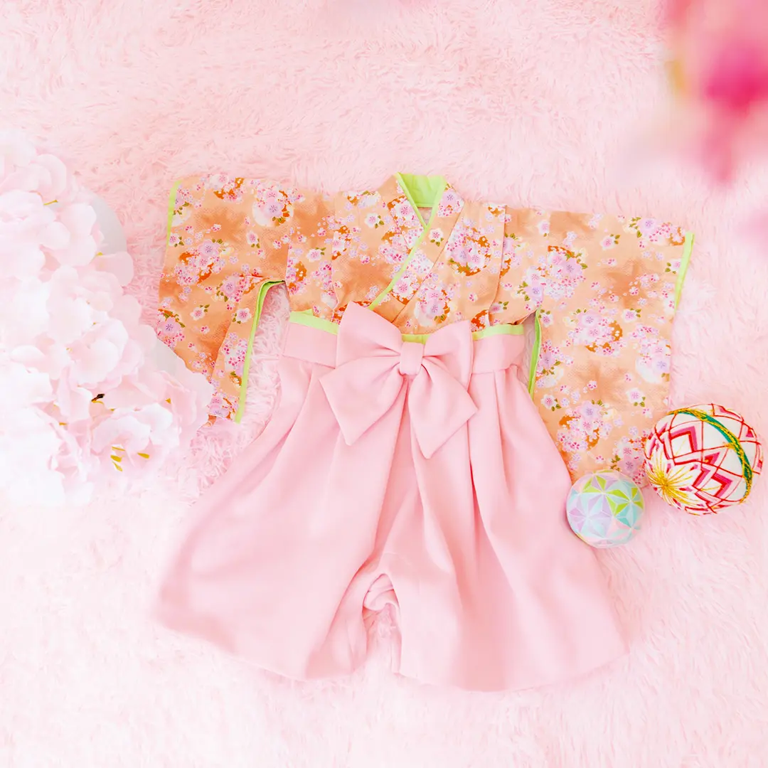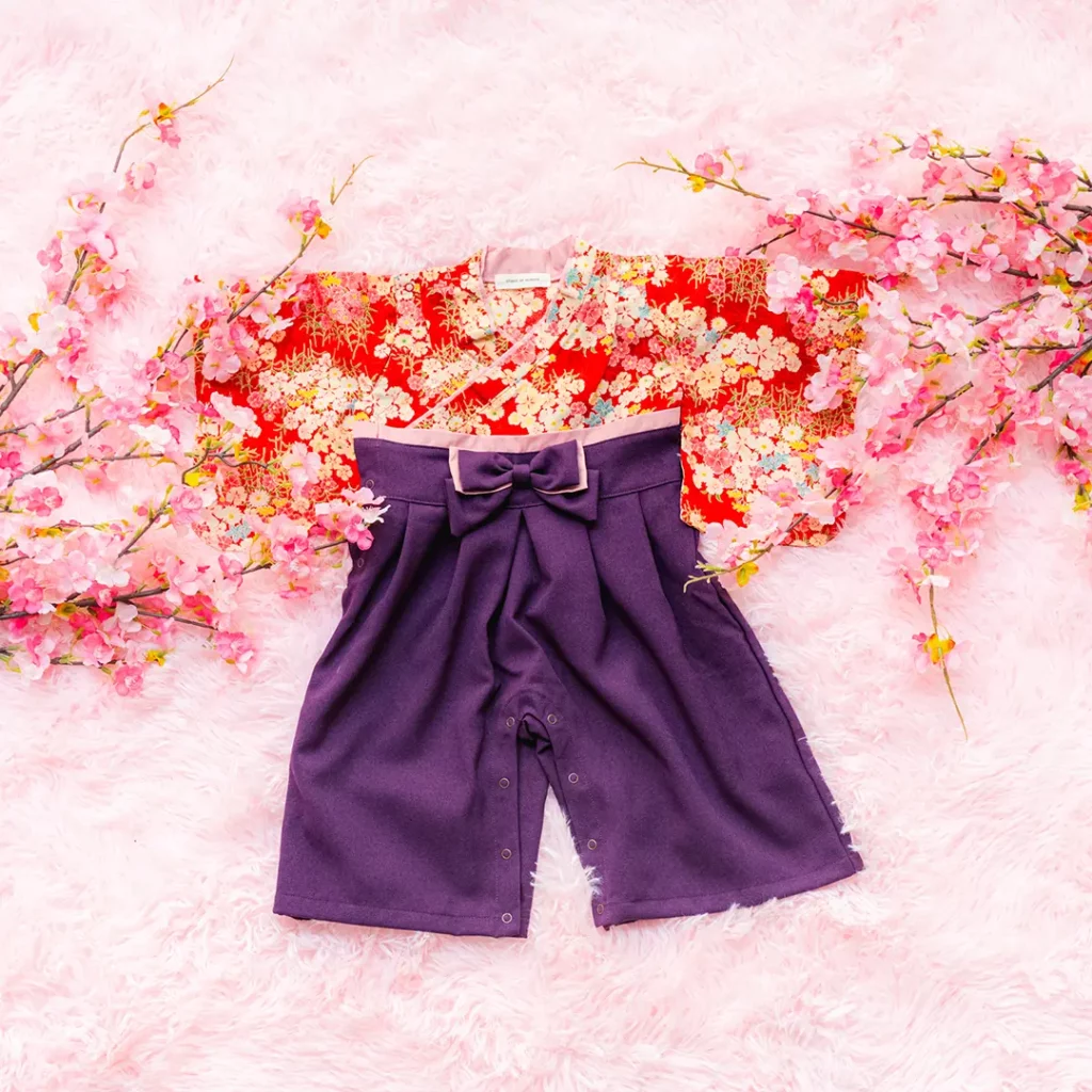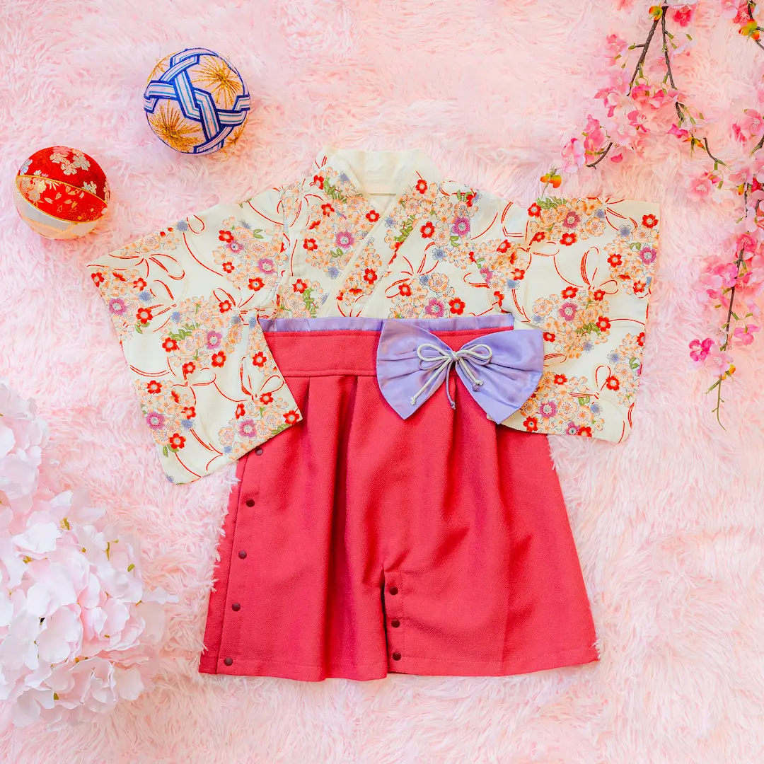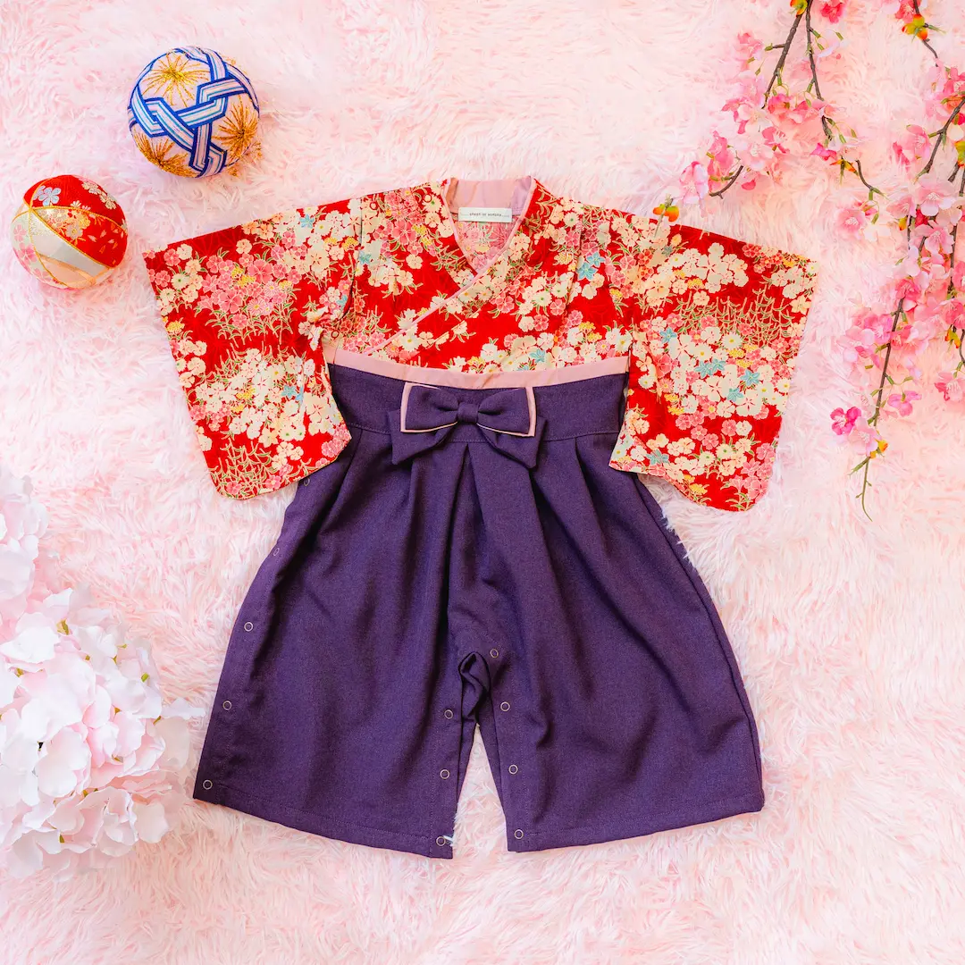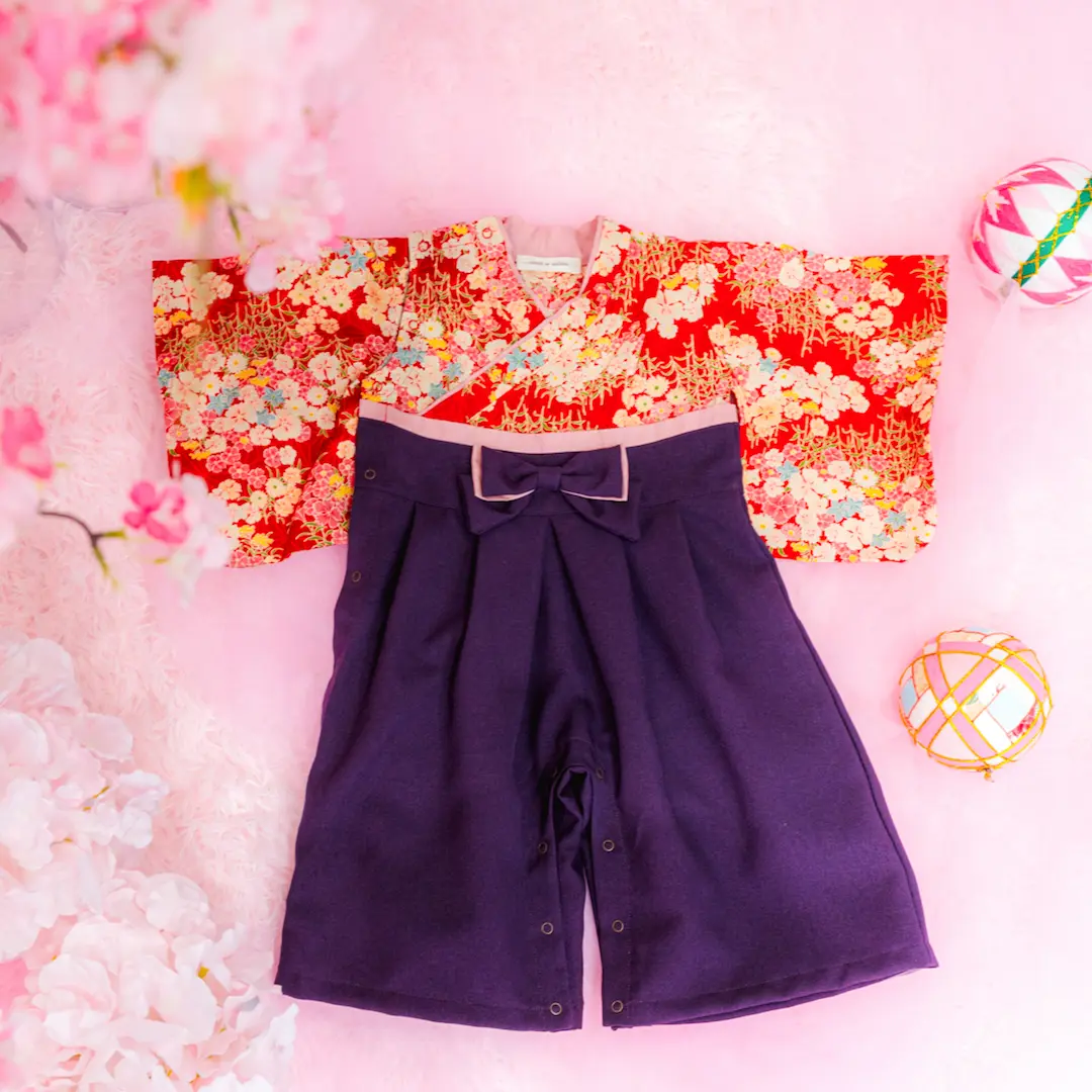 日本の伝統的なお花をあしらった袴カバーオールは