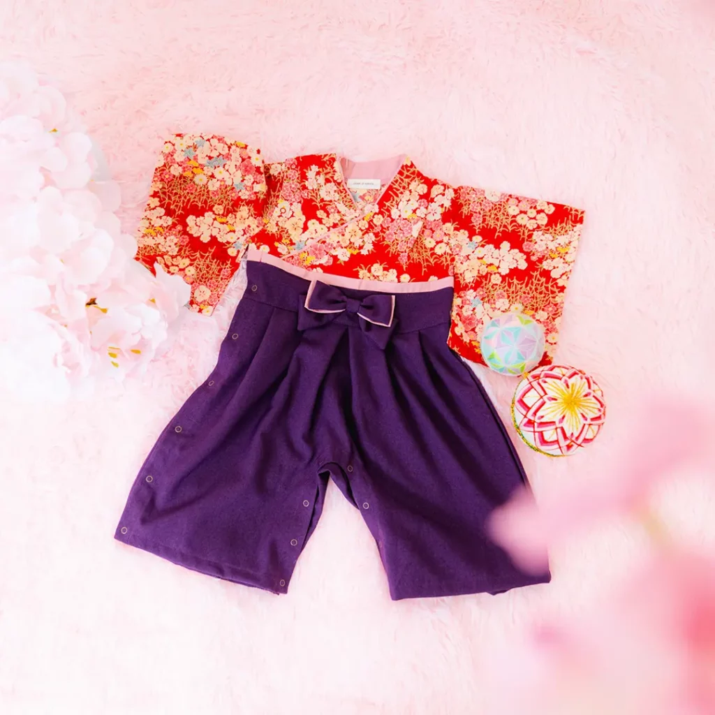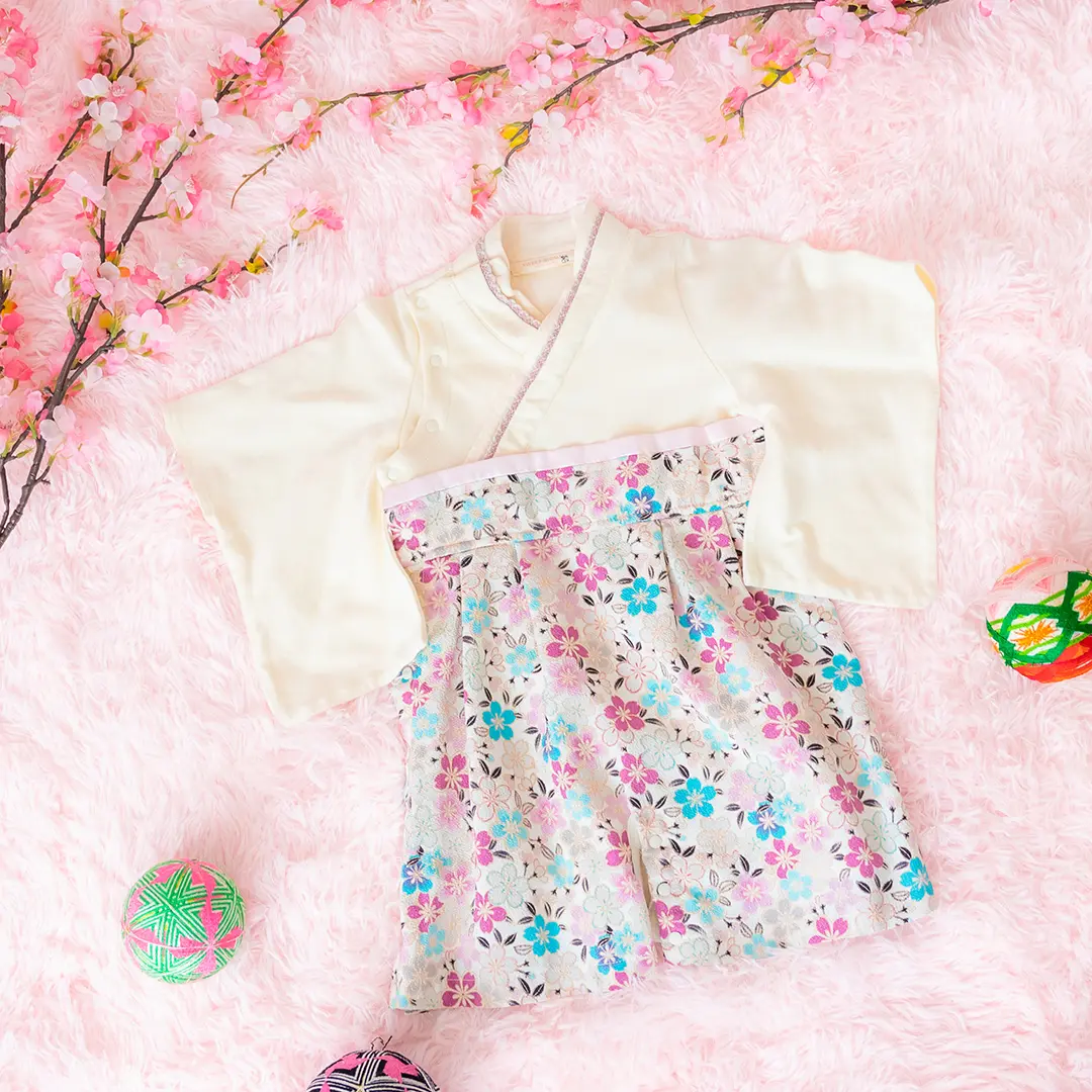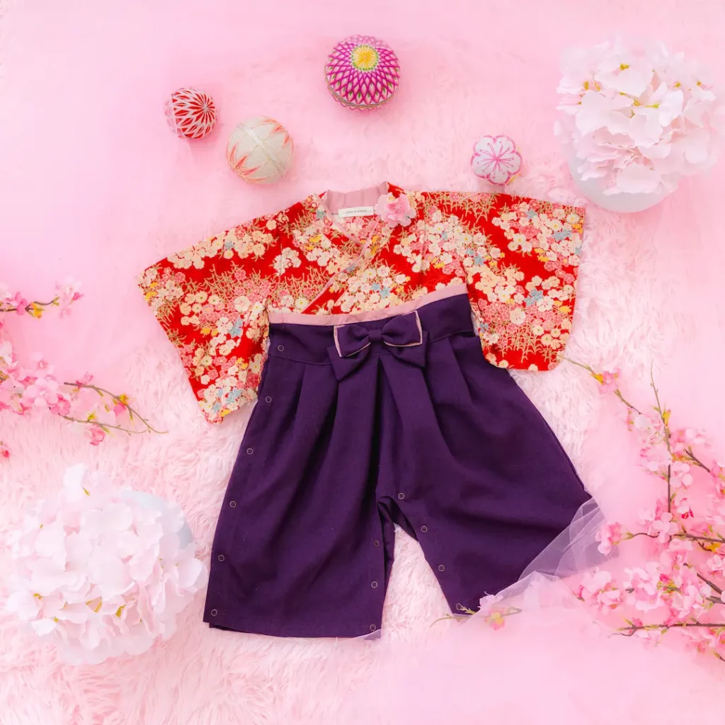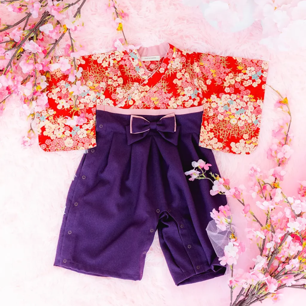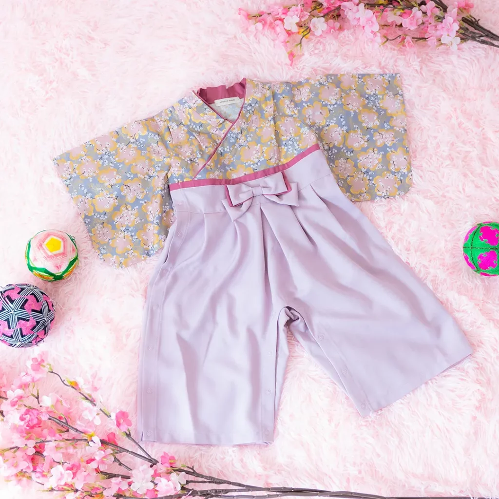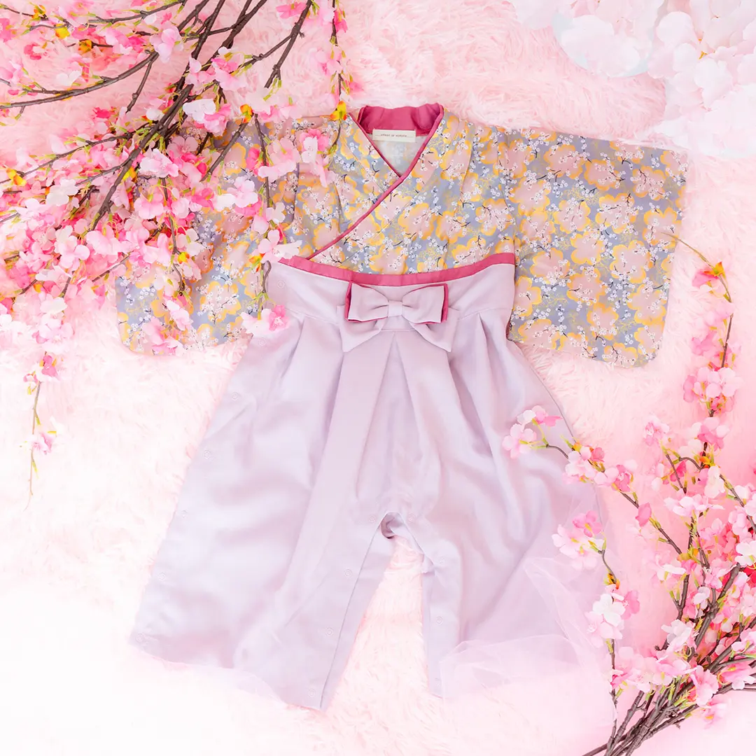 日本の伝統的なお花をあしらった袴カバーオールは