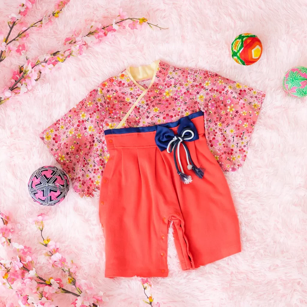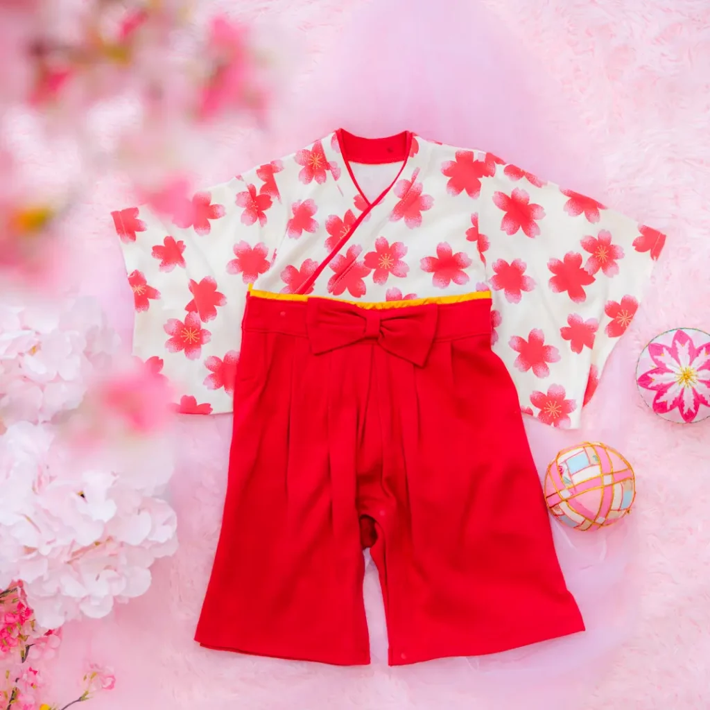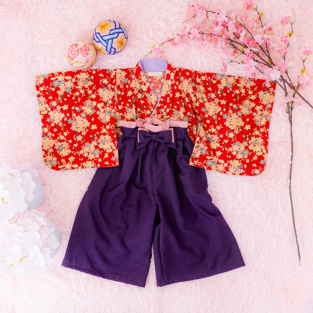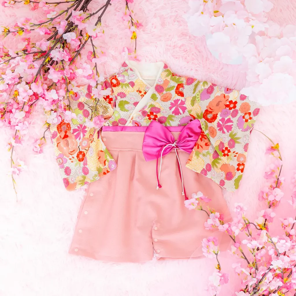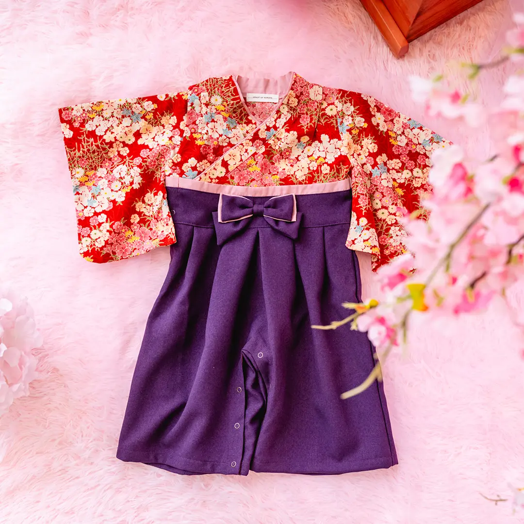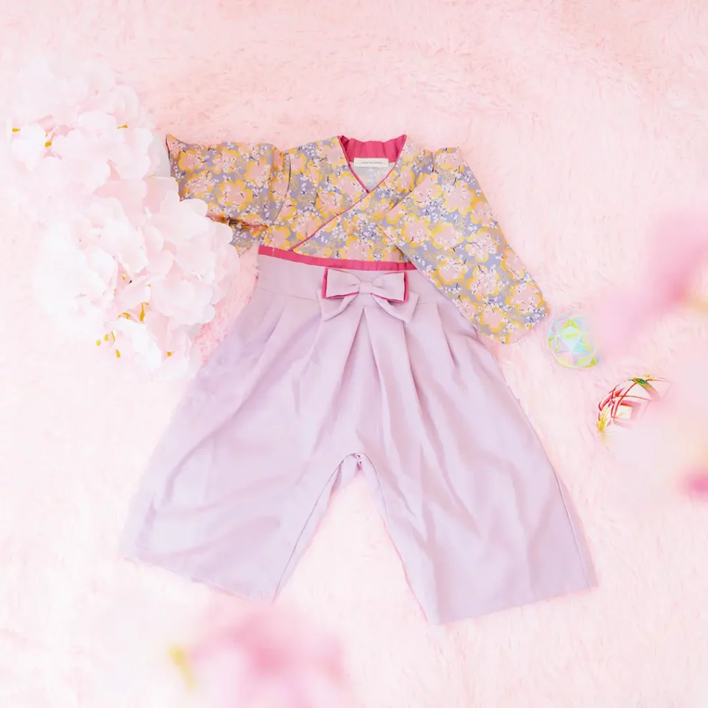 日本の伝統的なお花をあしらった袴カバーオールは