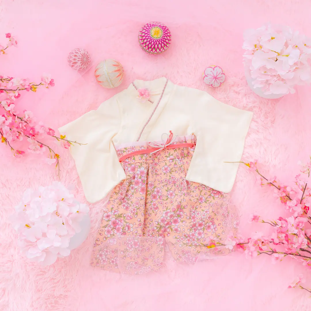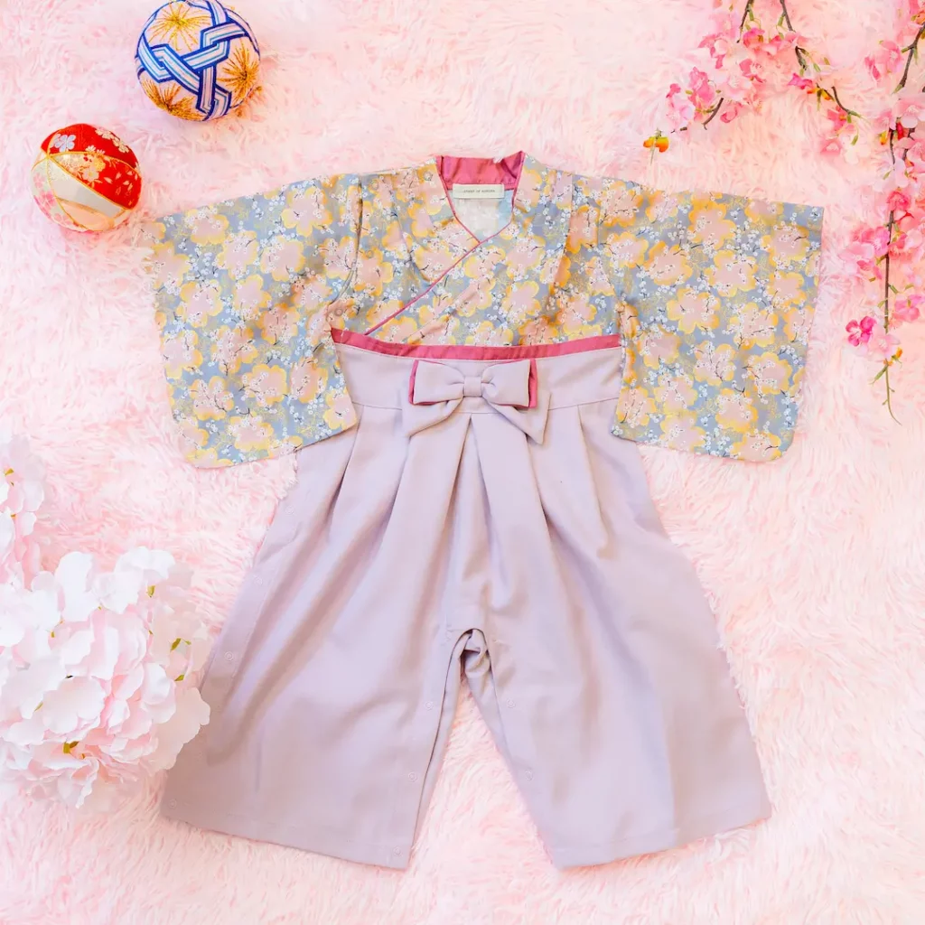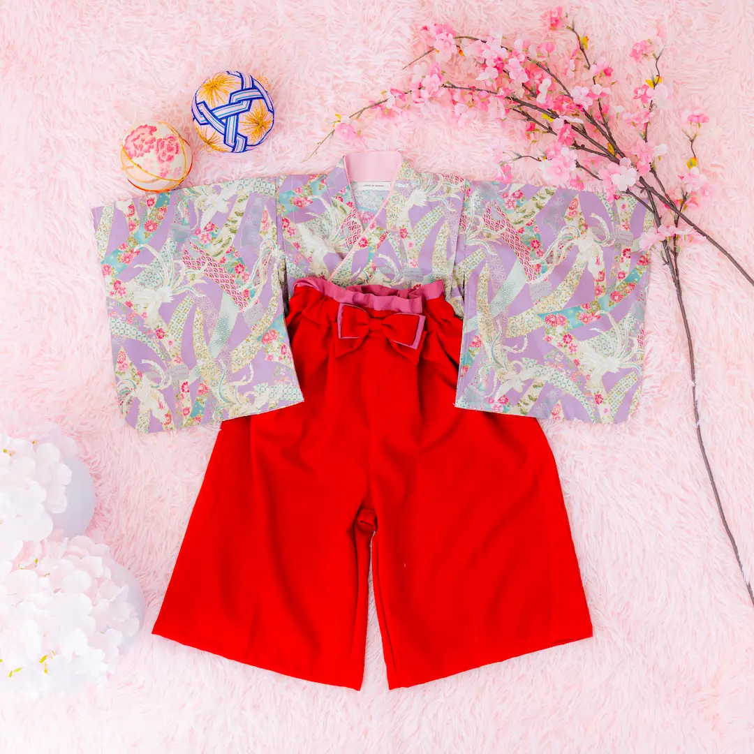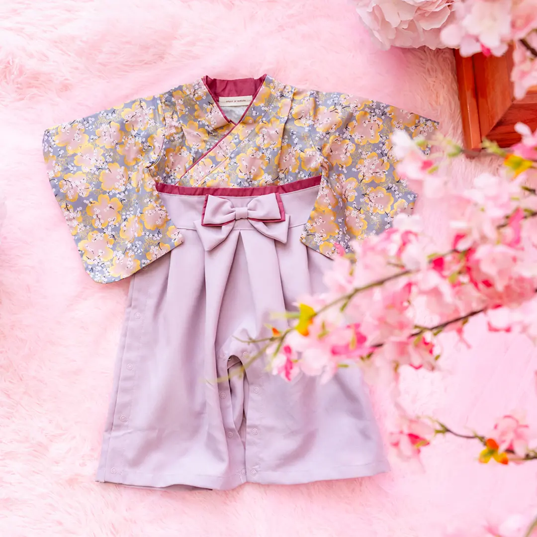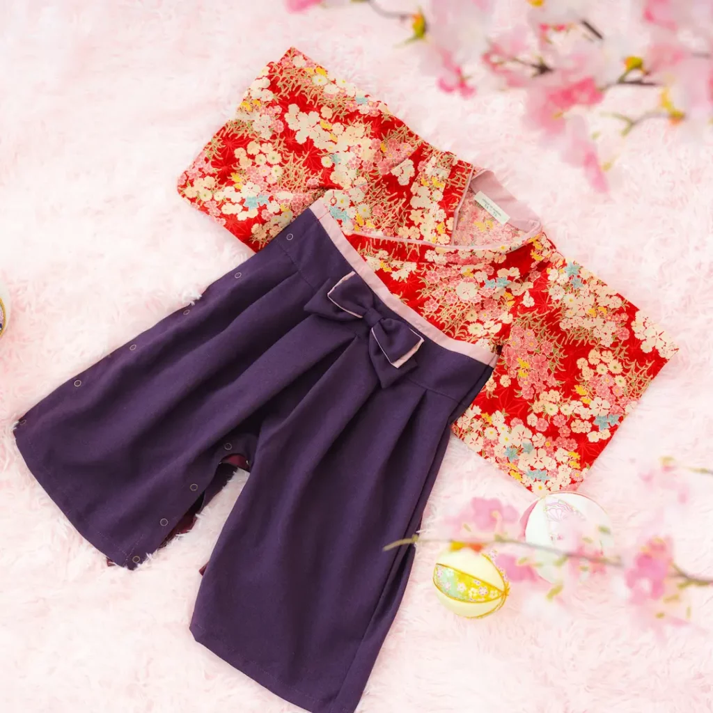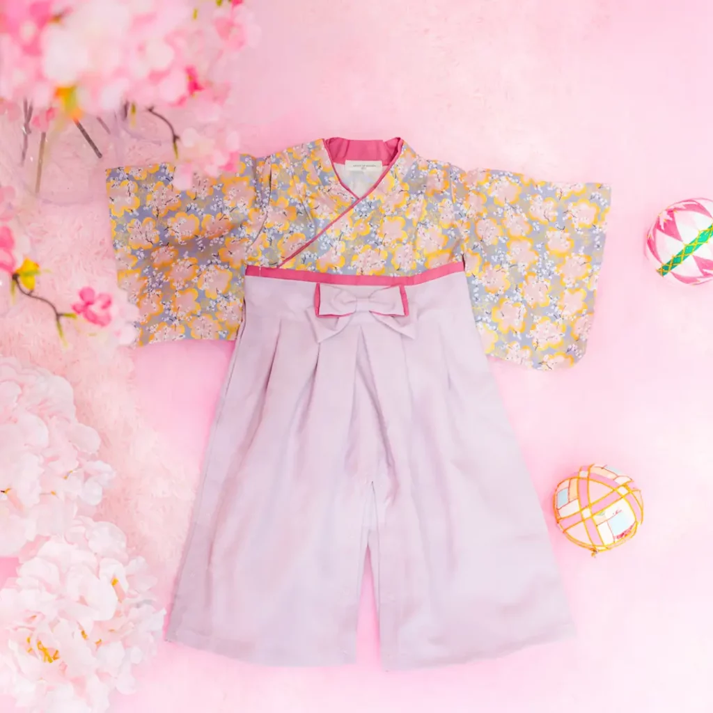 日本の伝統的なお花をあしらった袴カバーオールは