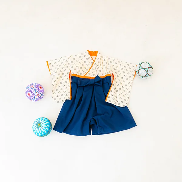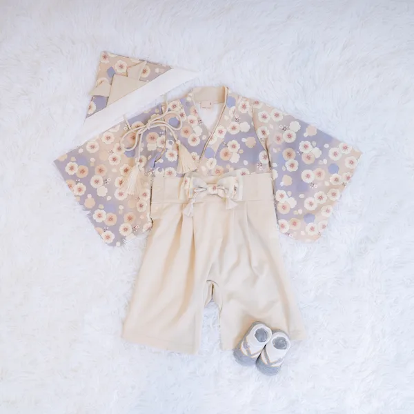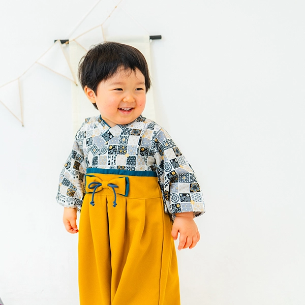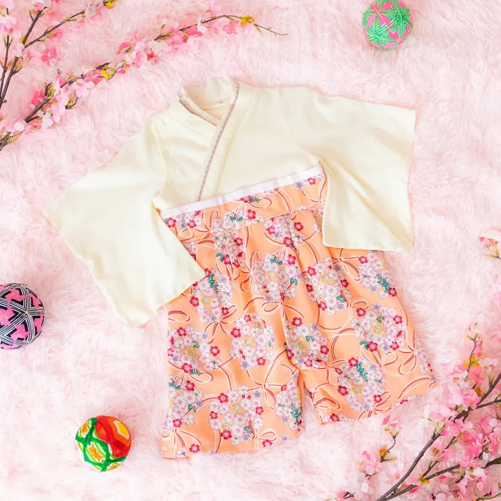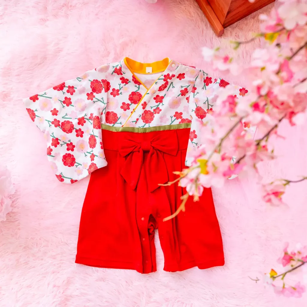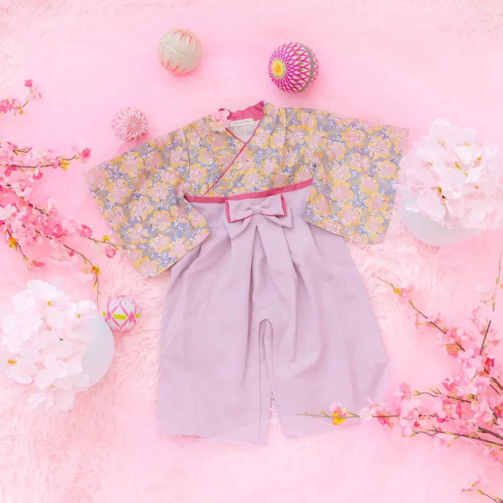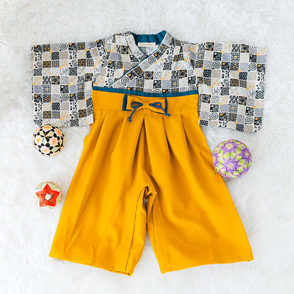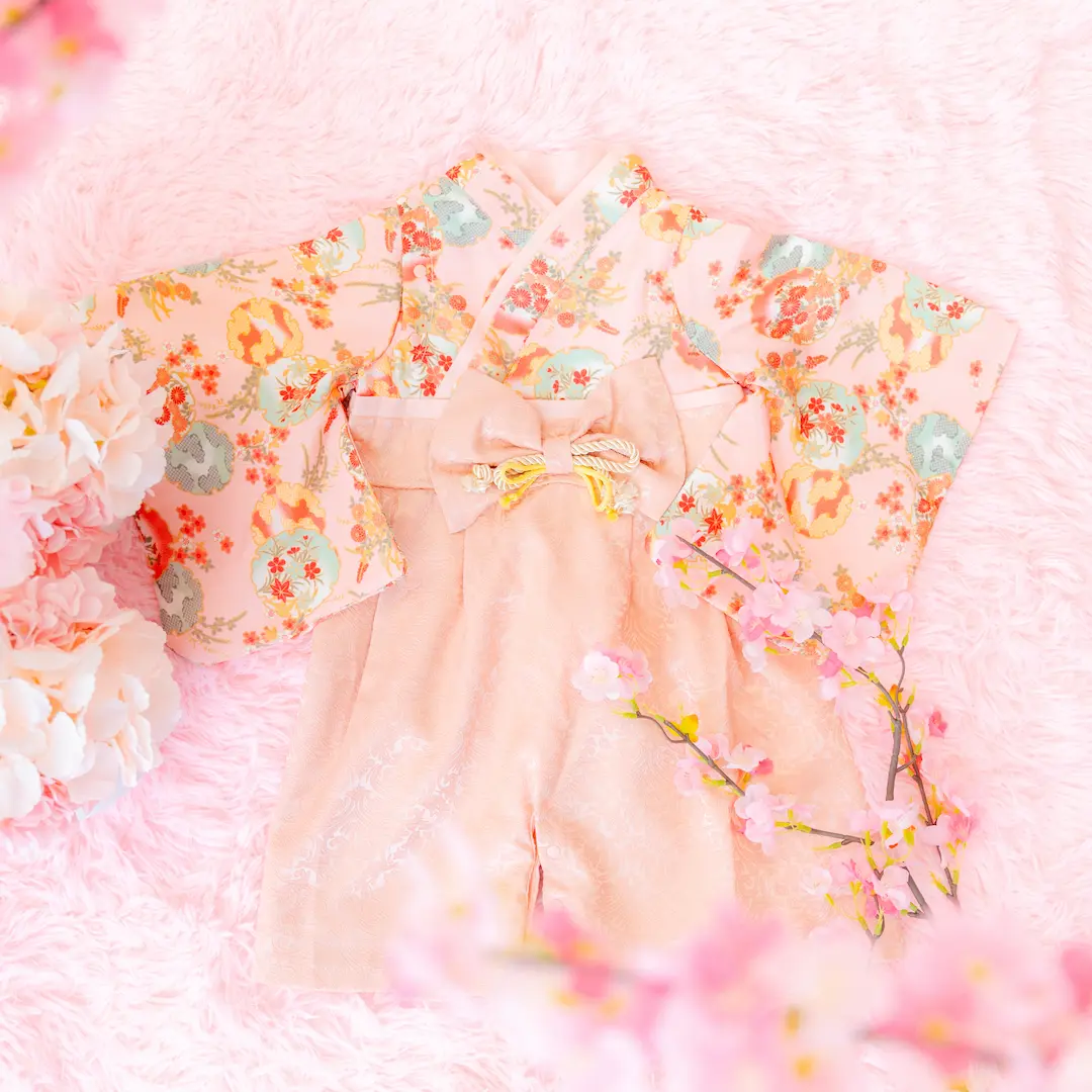 日本の伝統的なお花をあしらった袴カバーオールは
