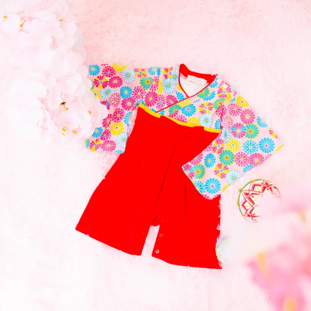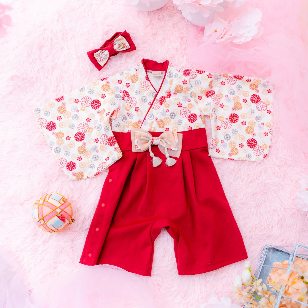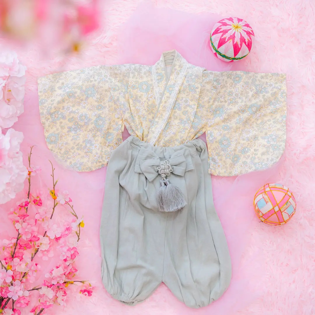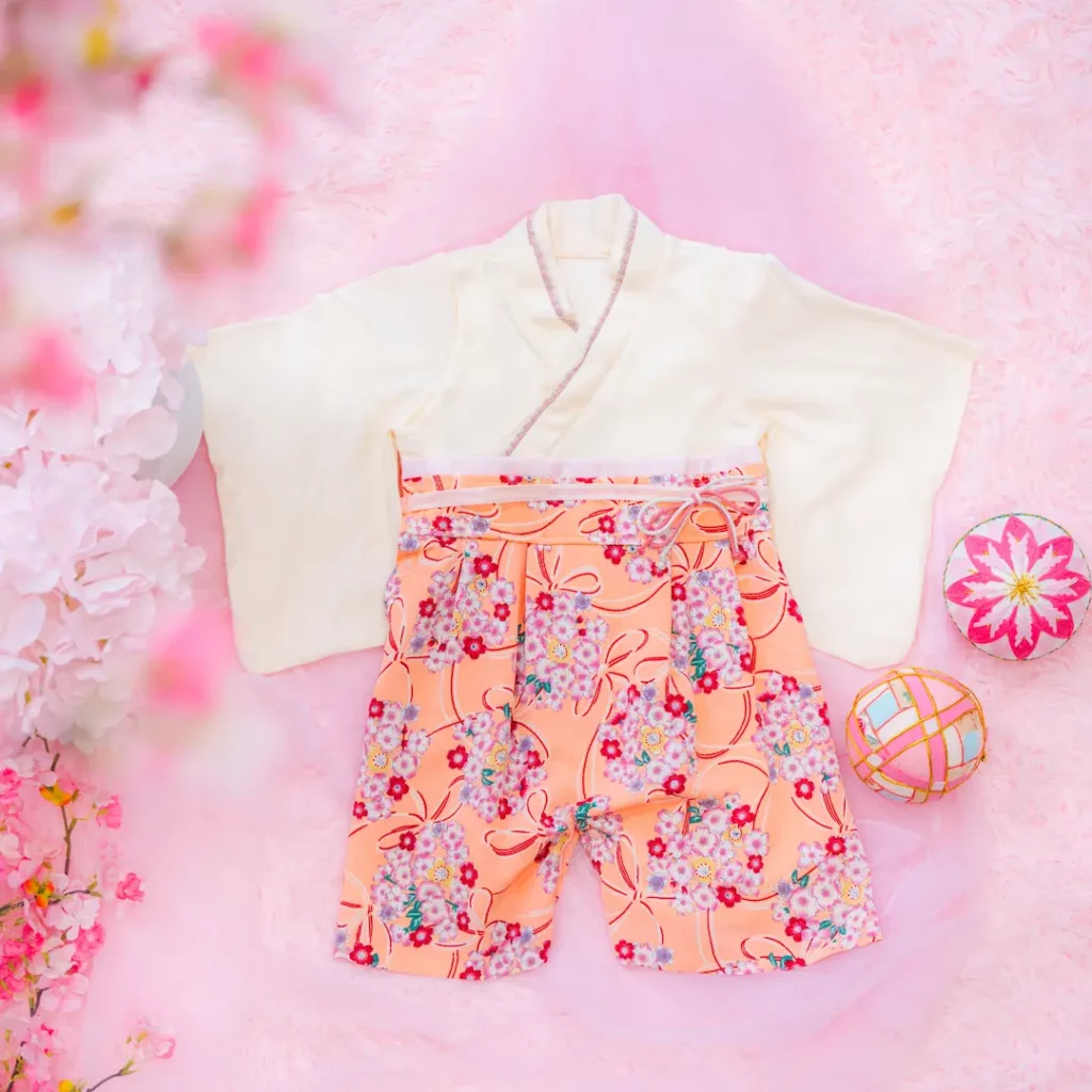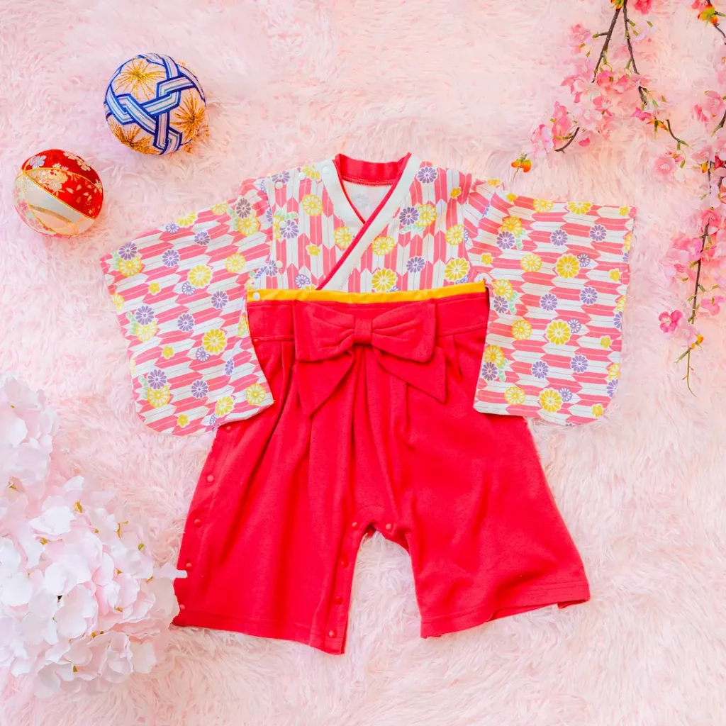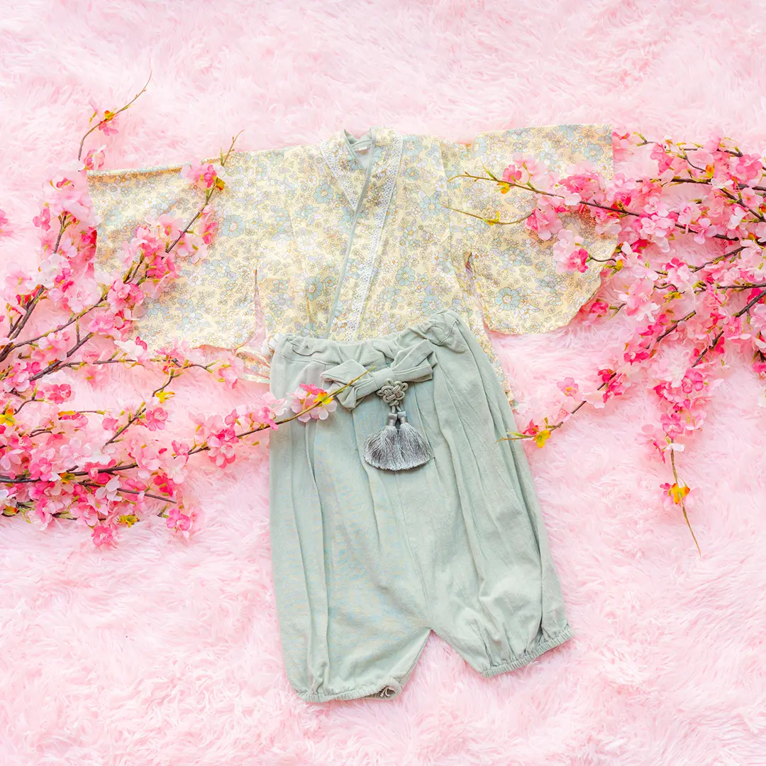 日本の伝統的なお花をあしらった袴カバーオールは