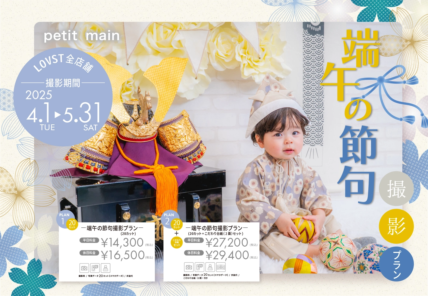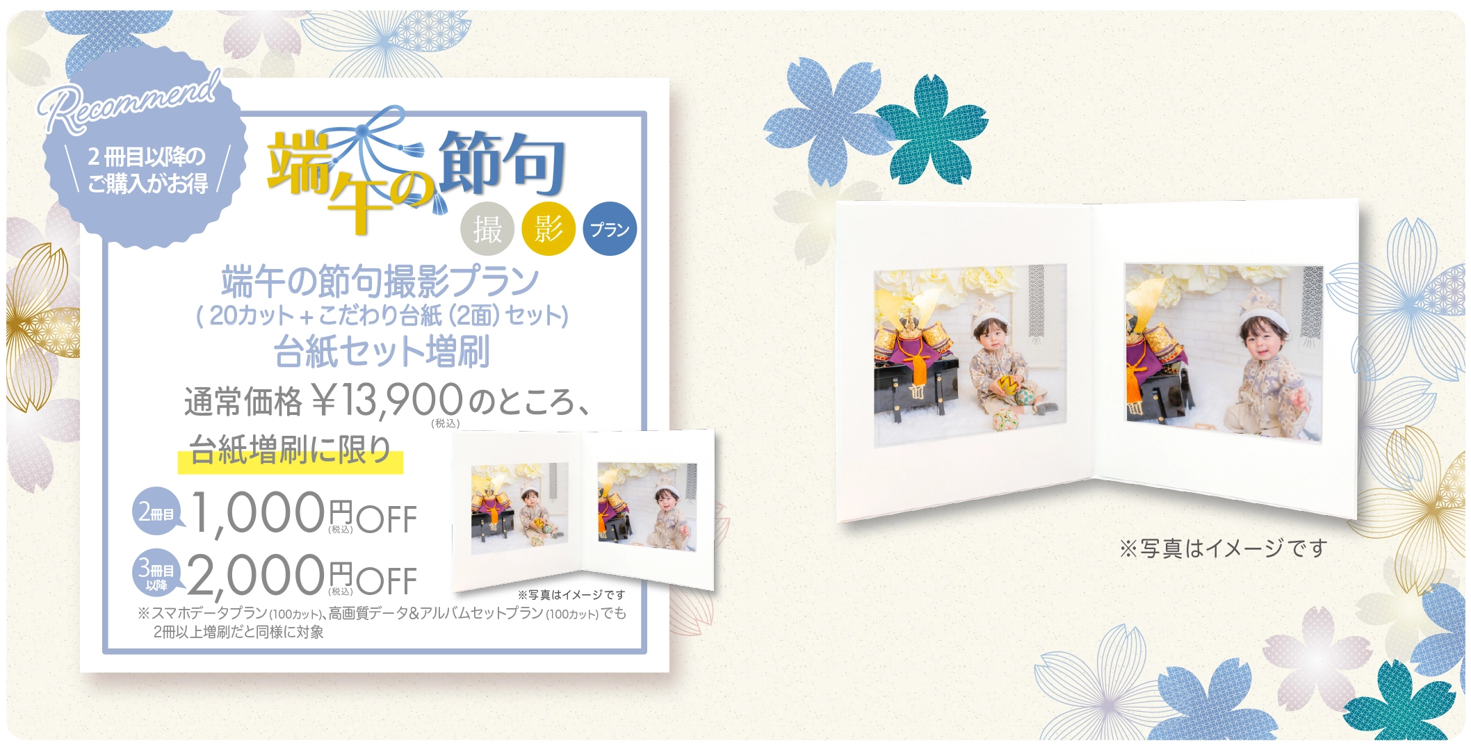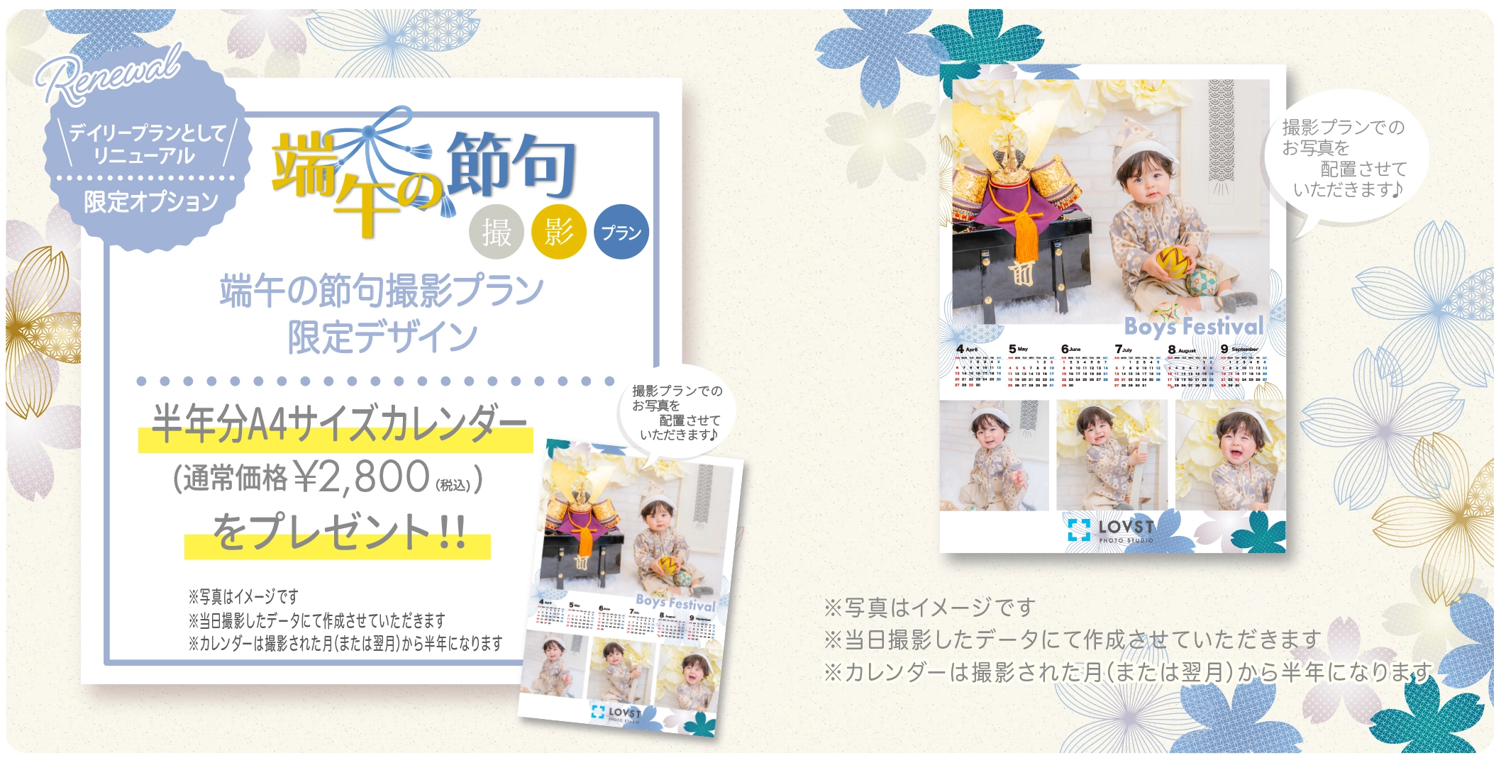 キャンペーン期間中の撮影で、端午の節句限定デザイン半年分A4サイズカレンダーをプレゼント!