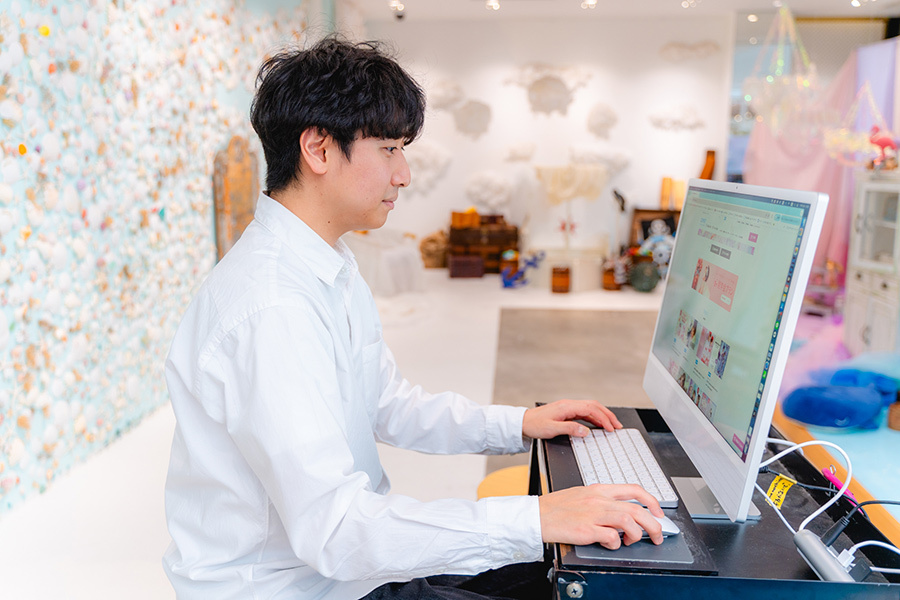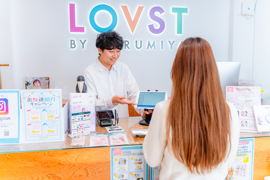 業務内容は写真の撮影や編集、お客様対応などの業務のほか、店長として新人の教育や日々の予算に対する目標立て、シフトの作成などもおこなっています。ミッションはご来店してくださる全てのお客様に笑顔になっていただくことだと考えていて、そのためにはスタッフが笑顔で楽しく仕事をしている必要があります。ただ何気なく仕事をこなすのではなく、なんのためにこの仕事を選んで働いているのか、お客様にLOVSTでどんな体験をしていただきたいのか、軸をしっかり持つことでお客様から良い反響をいただけて、自分自身のモチベーションも上がると思うので、教育面では撮影の仕方などの基本的な業務のレクチャーはもちろん、そういったことも指導していくことが、店長として重要な役割の1つだと考えています。