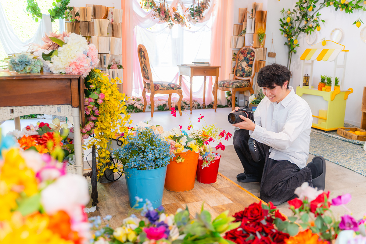 前職のフォトスタジオで2年弱勤務した後は、フリーランスのカメラマンとして活動していました。フリーランスではロケ撮影がメインだったので、またスタジオでも撮影がしたいと思って求人を探していた時に見つけたのが、LOVSTでした。LOVSTは1つのスタジオの中に異なるテイストのブースが複数用意されている点が印象的で、求人やホームページに掲載されていた写真からも他のスタジオとは異なる独特さや斬新さを感じました。面接時の雰囲気も良く、LOVSTだったら今までに撮ったことが無い写真やおもしろい経験ができそうだと思ったので、入社を決めました。