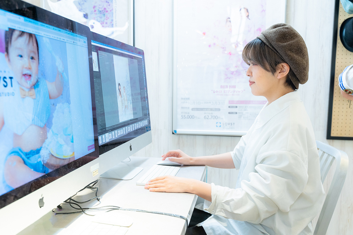 お客様の中にはベビーちゃんの頃から節目ごとにご来店してくださるお客様もいらっしゃるので、写真を通してお子様の成長を見届けられる瞬間は、この仕事ならではの魅力だと思います。店内はいつもお子様とご家族の笑顔で溢れており、可愛いベビーちゃんたちに癒されたり、パワフルなキッズたちとたくさん遊んだりして、いつもお客様からパワーをいただいています。
